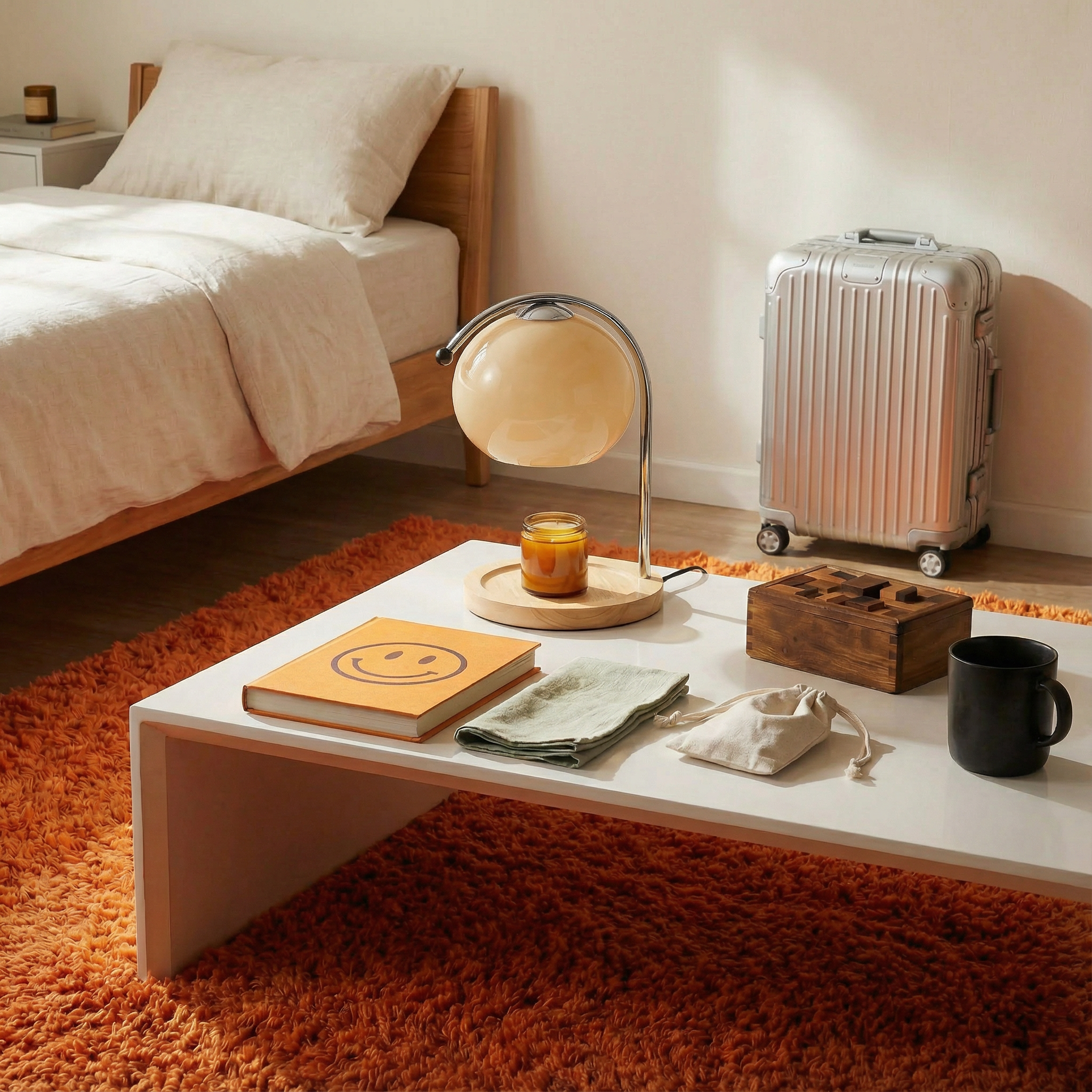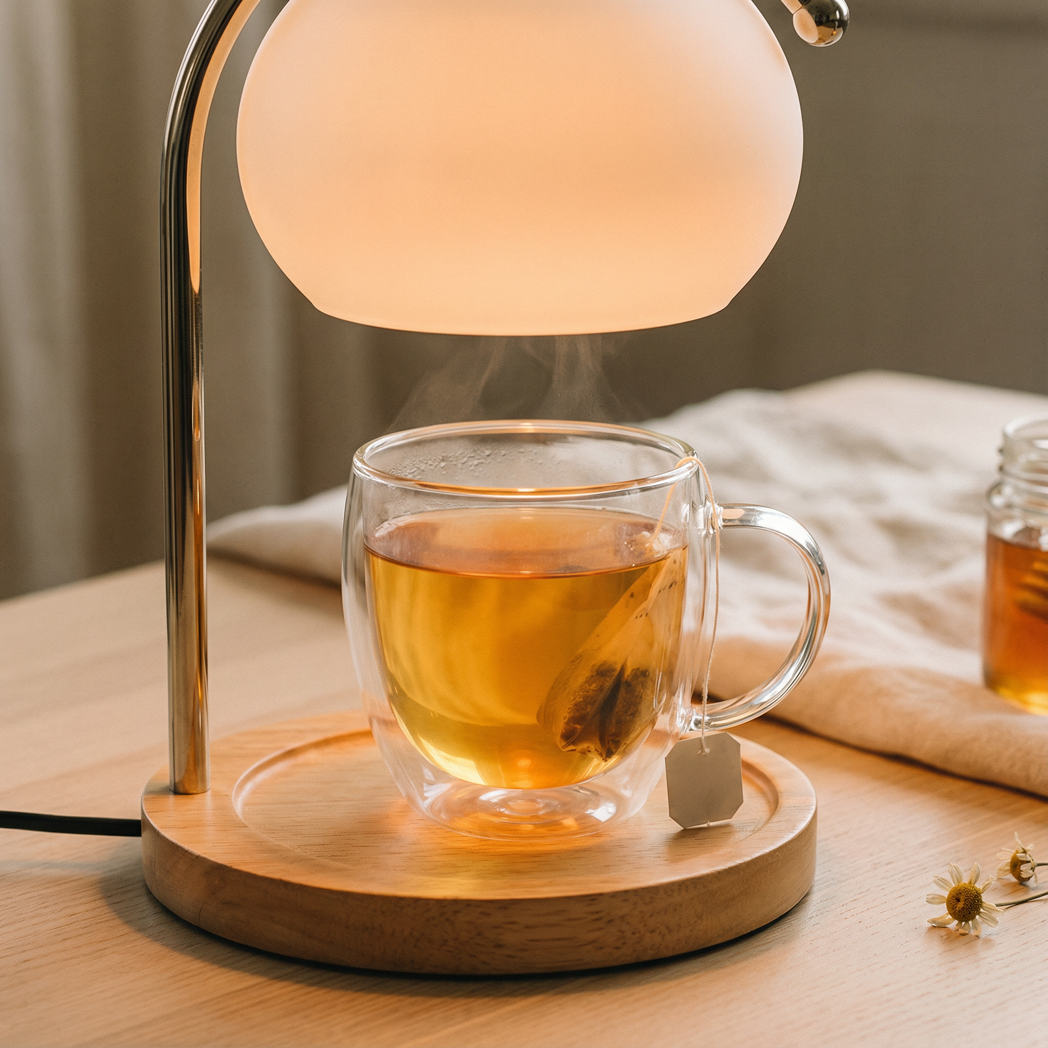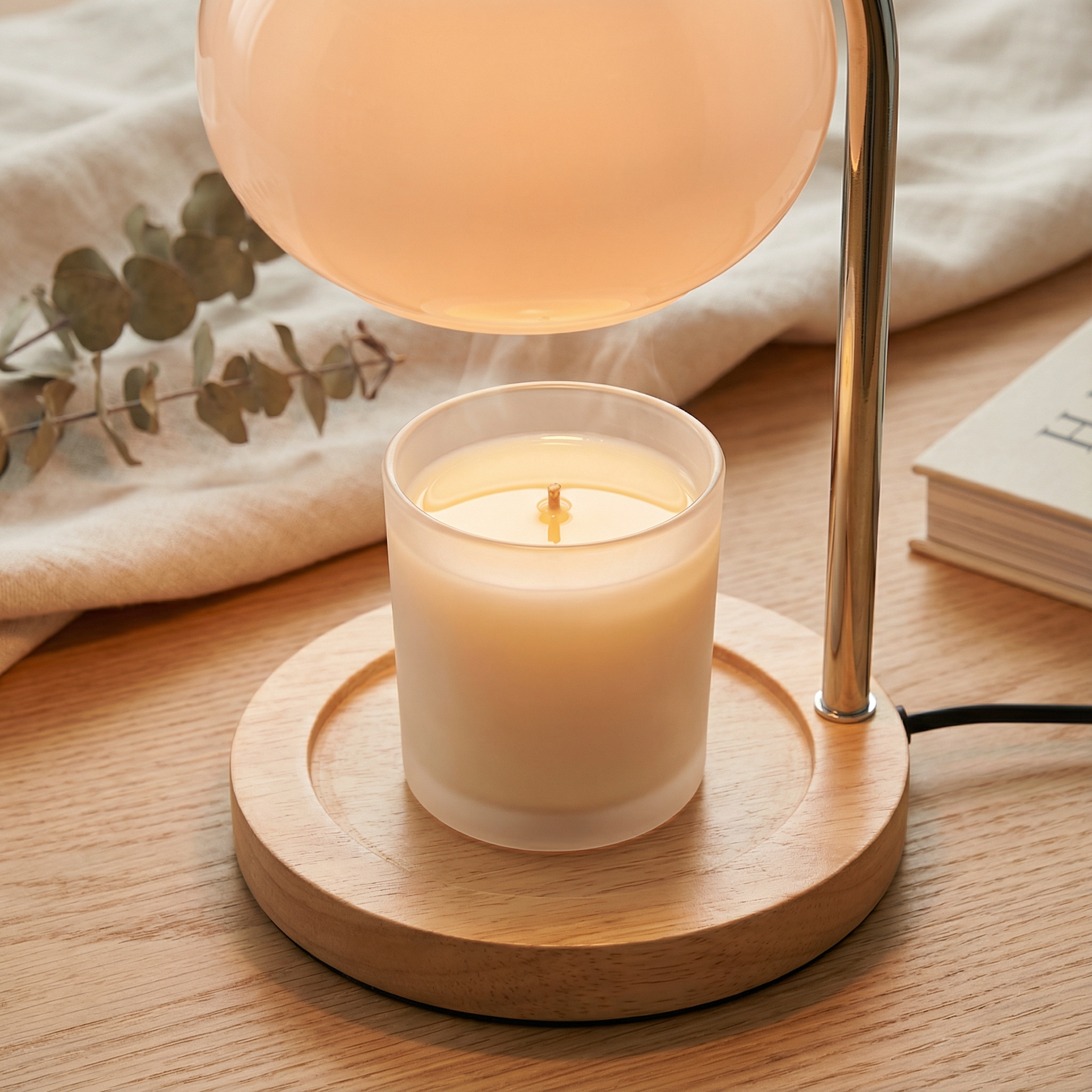 Used to juggle a burning candle (anxiety), cold tea, and harsh lamp. This lamp solved all three. Vanilla candle underneath, tea stays warm, peachy glow is perfect reading light. My nightstand went from cluttered mess to one beautiful lamp. Reading became even better.
