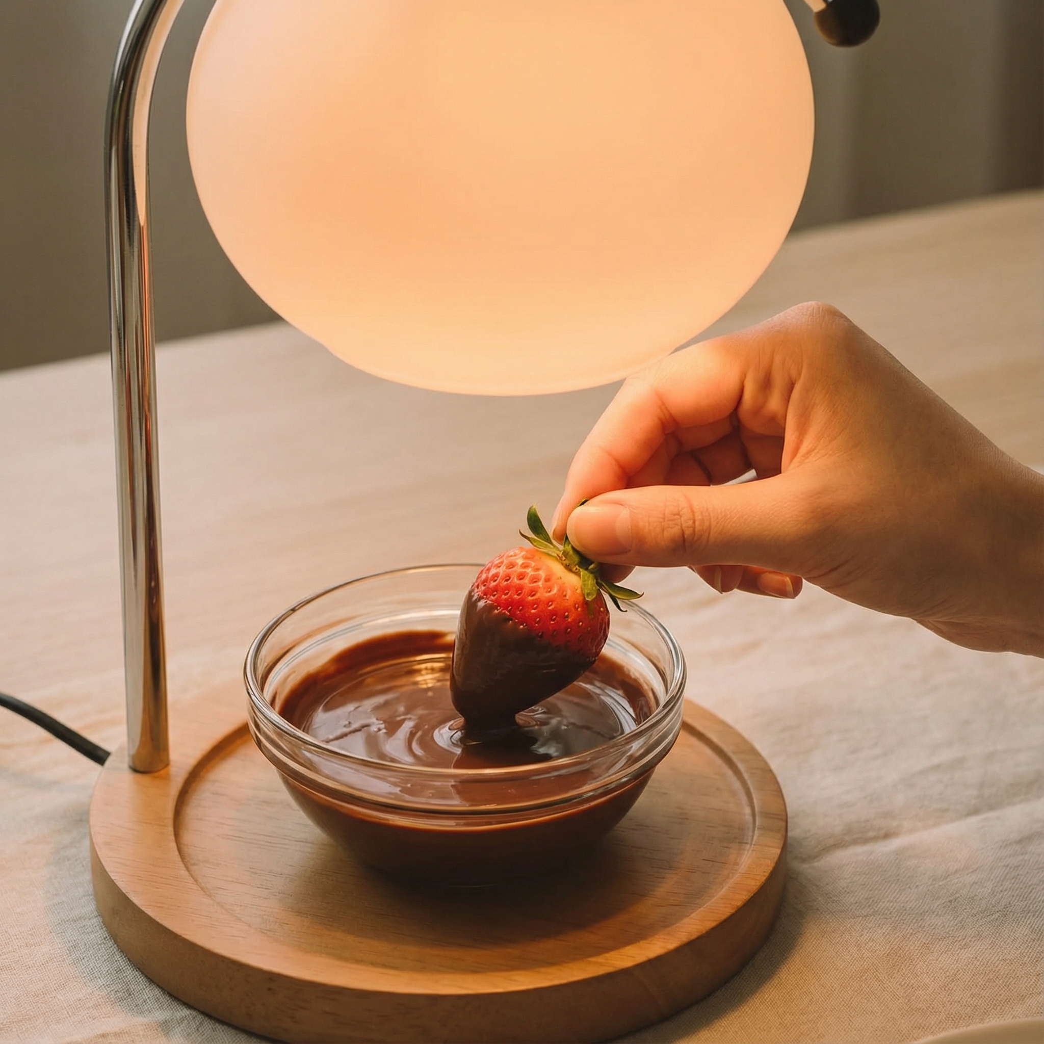 Forget the double boiler setup and constant stirring. Place a small bowl of chocolate (or cheese) on the wood, turn on the Meva lamp, and watch it melt to a perfect consistency in 5-10 minutes. The gentle, even heat keeps it smooth and warm without burning.