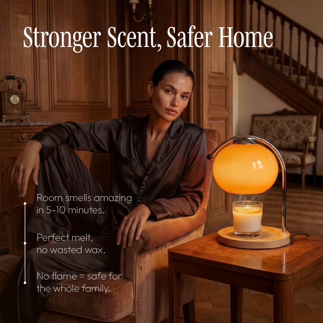 Our Meva lamps changes everything. The 50W bulb gently warms the entire top surface, melting wax evenly from edge to edge. Only the fragrance is released; the wax stays behind. Your candles last up to 5x longer, smell stronger, and there's zero smoke, soot, or open flame to worry about.